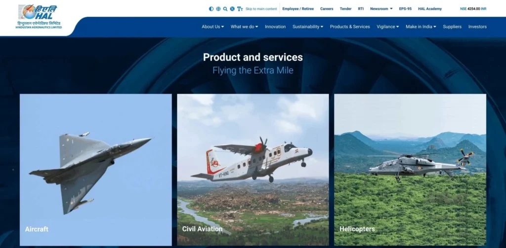 Hindustan Aeronautics LimitedAerospace & Defense₹15,200+ CroresAircraft, Helicopters, Aerospace SystemsOld Airport Road